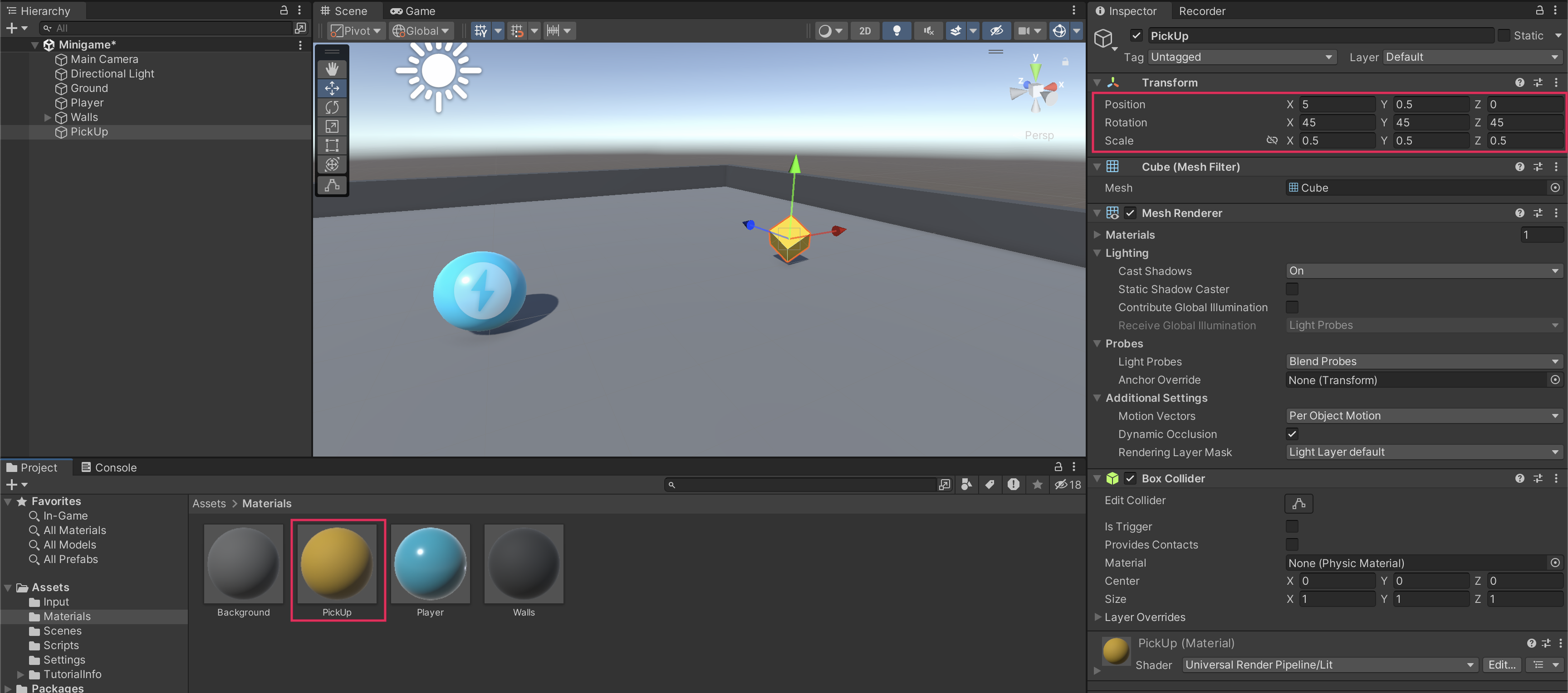Follow the video or text instructions below to create a PickUp GameObject, set the PickUp GameObject’s Transform values, and create a PickUp material: