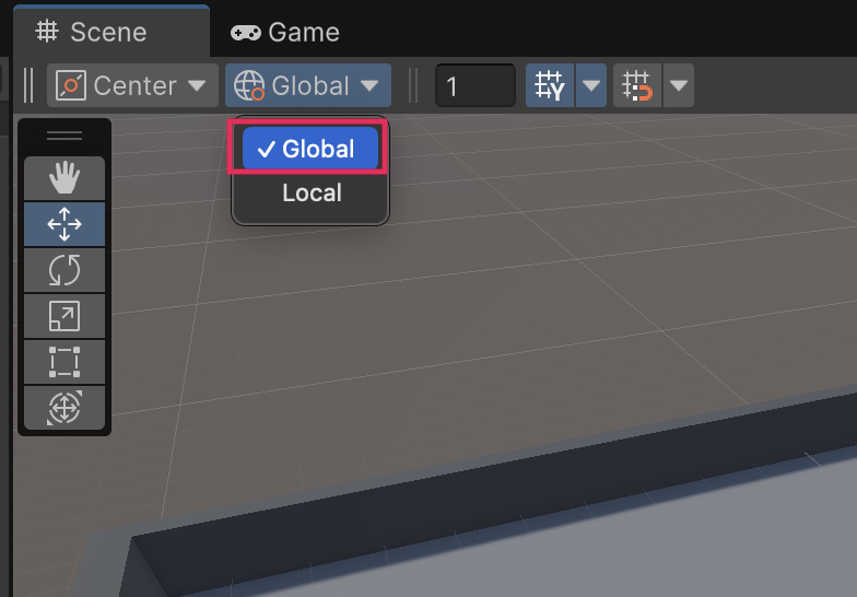 Important: Before beginning this step, set the tool handles in the Scene view to Global coordinates rather than Local. With Global coordinates, the Scene view tools will always point in the same directions, regardless of how the selected object is rotated. This will make it easier to move the Pickups straight along the X and Z planes.