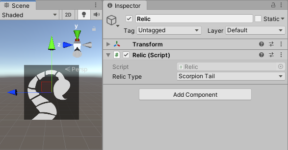 10. Click Add Component in its Inspector and select Relic.