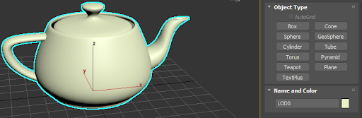 - Rename the teapot. Best practice is to use the naming convention of LOD#. For our example, let’s name it LOD0 (Figure 03).