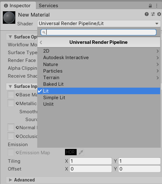 - Click the Shader dropdown under New Material in the Inspector window.