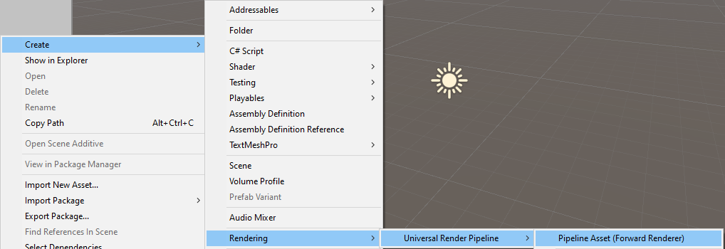 - Right click in the Project view and select Create > Rendering > Universal Render Pipeline > Pipeline Asset (Forward Renderer) (Figure 03).
