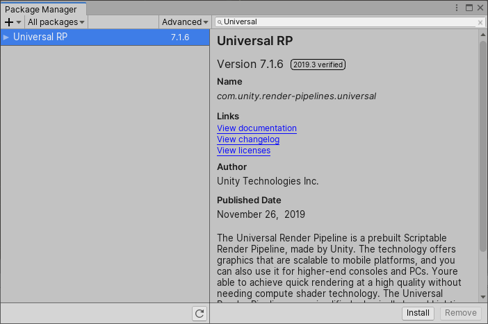 To upgrade an existing project, first download URP using Unity’s Package Manager.