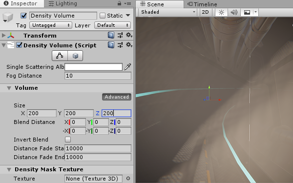 Notably, density volumes do not override one another. They are additive. Therefore, the global settings should reflect the least amount of fog that will exist in your Scene. Lower values — shorter distances — result in denser fog. A value of 50 is a decent starting point for thick fog (Figure 05).
