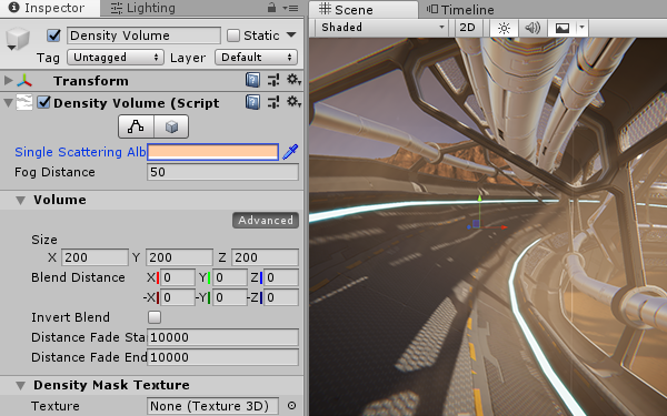 Single Scattering Albedo determines the tint and absorption ratio. The color you choose depends on your Scene. A misty haze might be white or off-white. Dense smoke or smog would be darker. Sand would be a light shade of orange (Figure 05).
