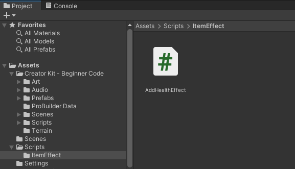 3. In the Project window, go to Assets/Creator Kit - Beginner Code/Scripts/ItemEffects.