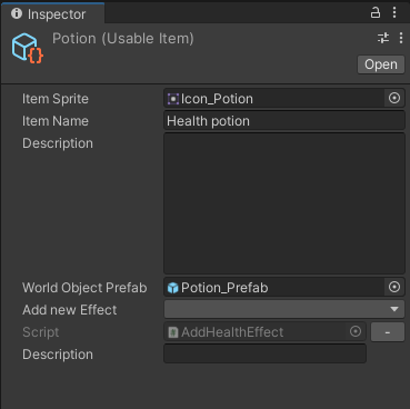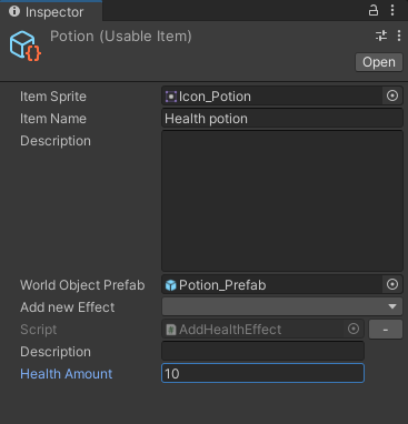 3. In the Inspector, use the Add New Effect drop-down menu to select the AddHealthEffect. This will appear in the Script field beneath.