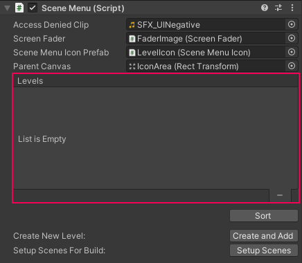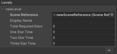 2. In the level list, you will see the Scene Reference field for your new level. This is an Asset specific to this game, which allows information to be transferred between the level and its menu. You don’t need to make any changes to this field.