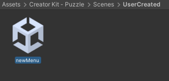 2. Find newMenu in the Project window, at the file path Assets/Creator Kit - Puzzle/Scenes/UserCreated.