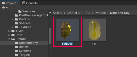2. Select the FatBlob Prefab. This will act as a lock for doors in your game.