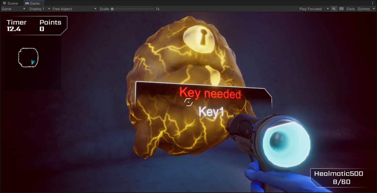 6. Save your game, then test it in Play Mode. When the doctor gets close enough to the lock, the name of its associated key will be displayed: