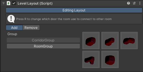 4. If you make a mistake or want to remove a room, click the Remove button in the component. Once you’ve done this, moving the cursor over rooms and corridors in the Scene view will highlight them. Click on a room to remove it.
