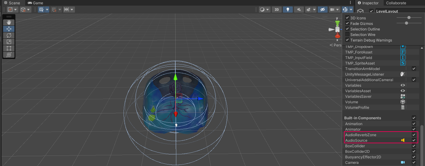 TIP: You’ve turned off Gizmos for all Audio Reverb Zones and Audio Sources. If you need to see their range at any point, you can turn the Gizmos on by enabling their checkboxes again.