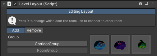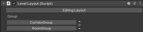 2. In the Inspector window, find the Level Layout component. Click Editing Layout. This will enable Add mode by default. Then click either CorridorGroup to add Corridors, or RoomGroup to add Rooms.