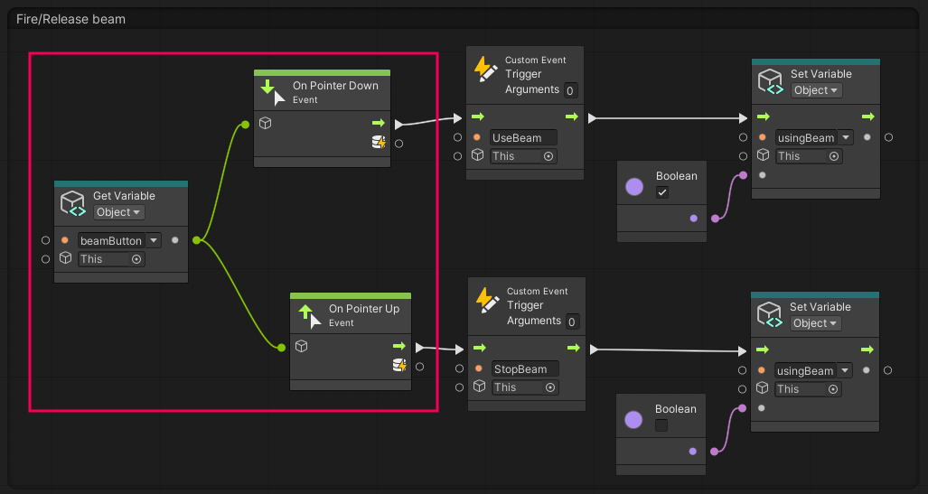 10. Connect the beamButton variable to both On Pointer nodes.