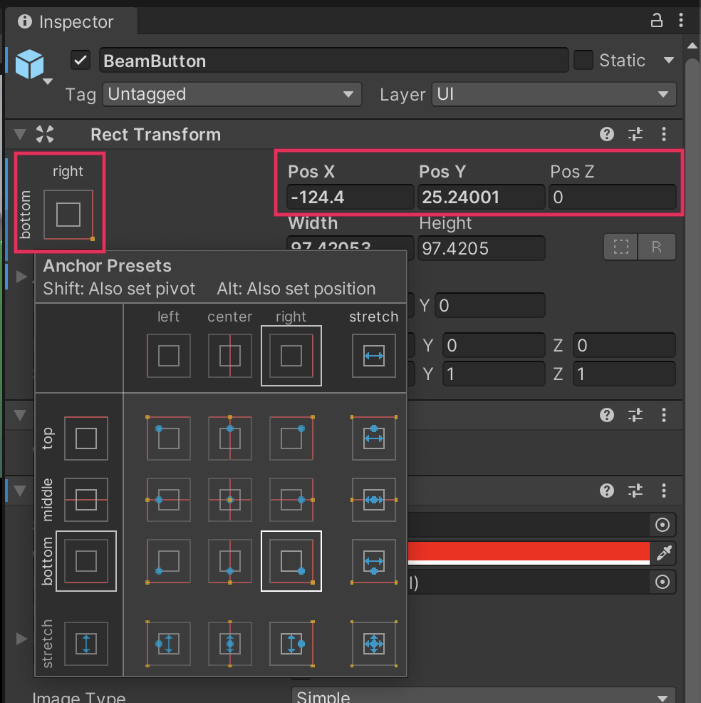 4. In the Rect Transform component, use the Anchor Presets menu and the Position properties to position the button somewhere convenient on the screen using Shift+left-click.