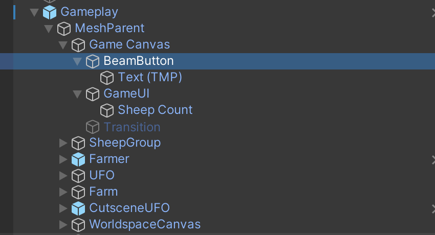 2. In the Hierarchy window, create a new UI Button GameObject as a child of GameCanvas (organized under Gameplay > MeshParent). Name the new GameObject "BeamButton".