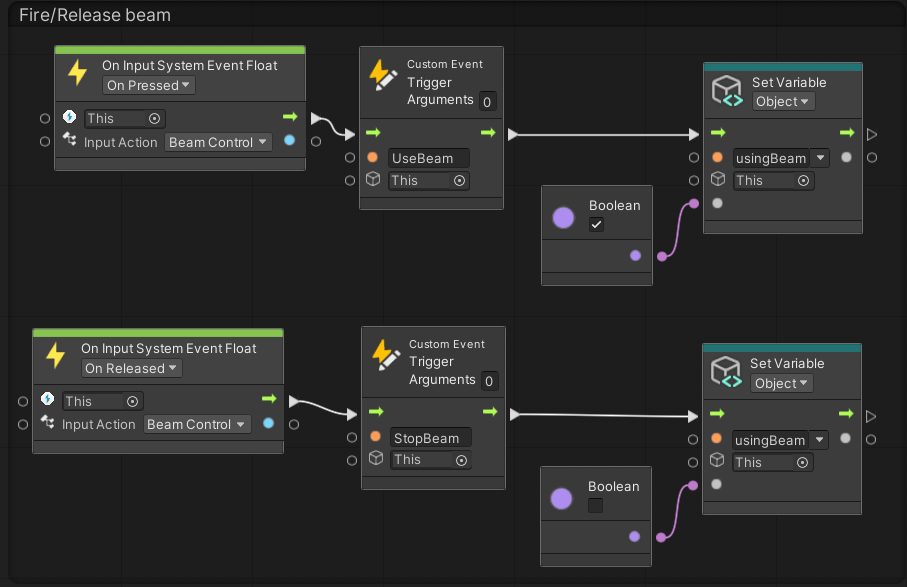 - When the Spacebar key is pressed, the UseBeam custom event is called and the usingBeam Boolean is set to true.