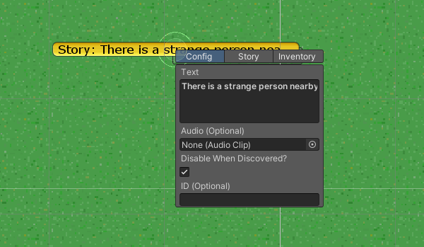 9. Enter Play Mode to test your Story Item. When the player character walks into its space, the story item text will appear on screen. Remember to leave Play Mode when you've finished testing.