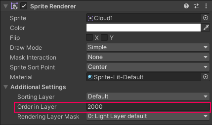 6. In the Inspector, find the Cloud GameObject’s Sprite Renderer component. Set the Order in Layer parameter to 2000.