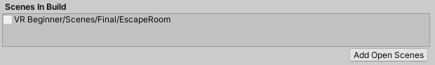 2. In the Scenes in Build section of the Build Settings dialog window, disable the EscapeRoom Scene.