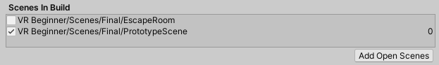 3. Select Add Open Scenes to add the Prototype Room to the build.