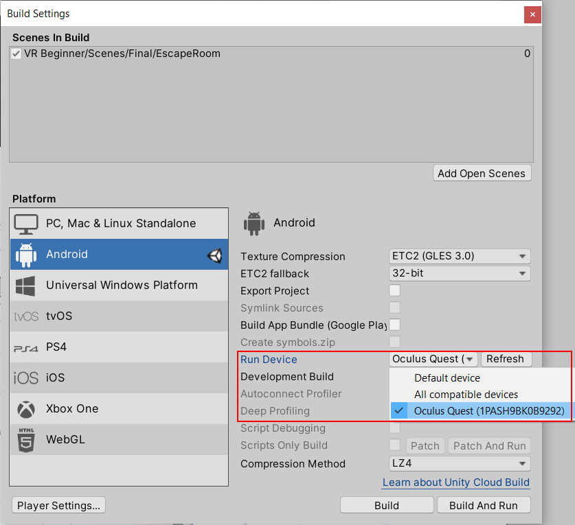 4. In the Run Device field, make sure that your Oculus Quest is selected. If it is not available, check that it is set up correctly.