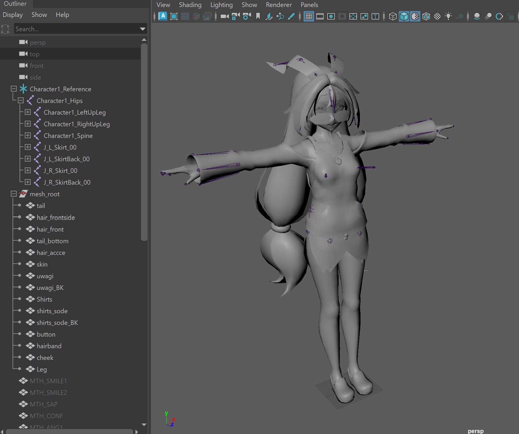 You'll notice in the Outliner there are two parent nodes, Character1_Reference (skeleton hierarchy) and mesh_root (meshes). For a clean export of the skelmesh, let's say we want to export only these two root nodes and all their children.