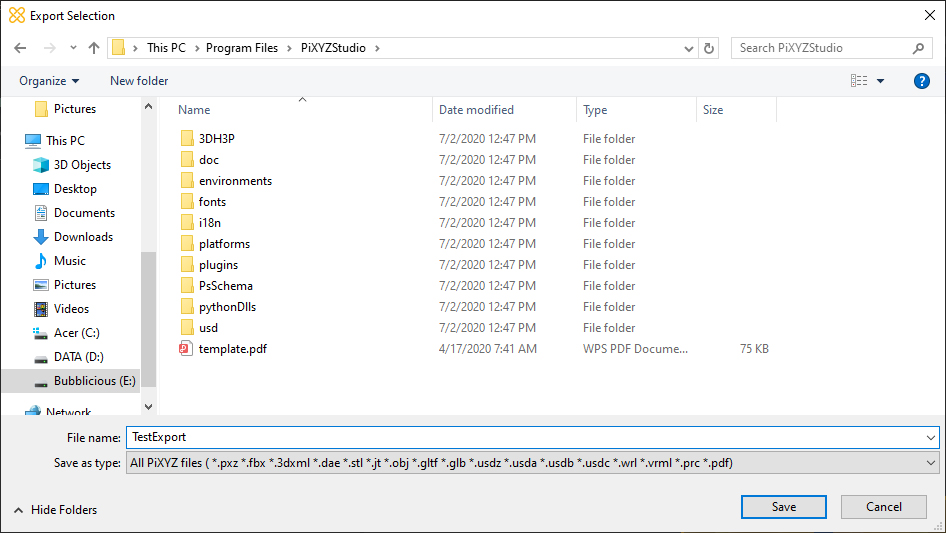 The supported export formats are: fbx, 3dxml, obj, gltf, glb, usdz, usda, usdc, prc, and pdf. If you leave Save as Type as All PiXYZ files, it will save the model as an .fbx file.