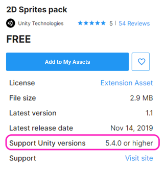 4. When searching for an asset for your project, it is critical to make sure that the assets will be compatible with your version of Unity. Select a product to view its Details page, where you will see all the information about the asset, including the Unity version compatibility.