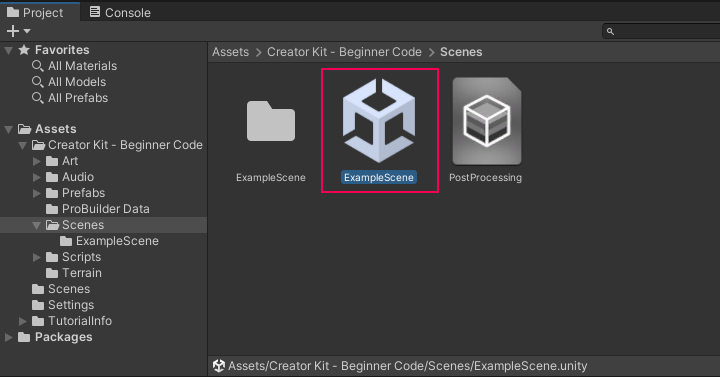 1. In the Project window, go to Assets/Creator Kit - Beginner Code/Scenes.