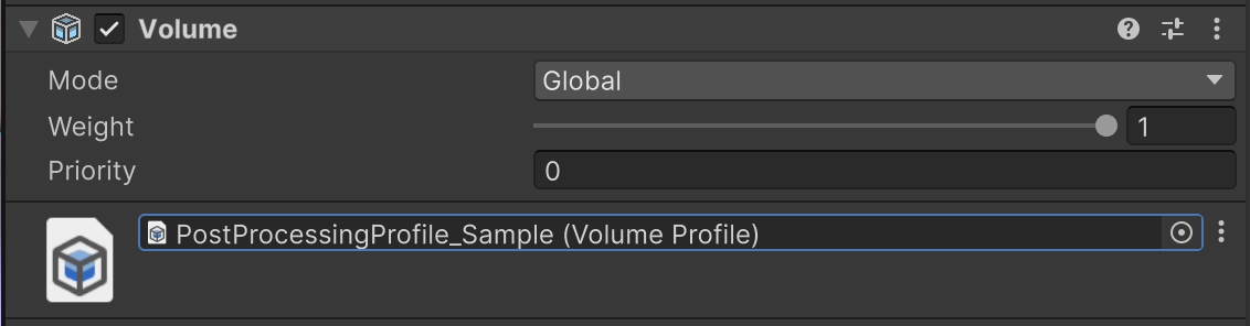 3. In the Volume component, use the object picker to select the PostProcessingProfile_Sample profile.