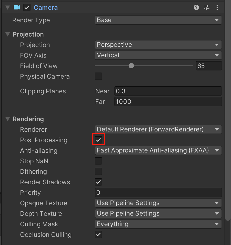1. Hierarchy で Main Camera を選択し、Camera コンポーネントで Rendering 折り畳み内にある Post Processing チェックボックスを選択し、有効にします。