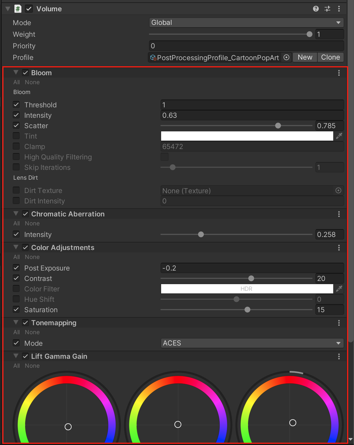 このポストプロセスプロファイルは、部屋をより楽しく、漫画のようなスタイルにします。それは、下のサンプル画像のようなカラフルでコントラストの強いポップアートのようなスタイルに似ています。