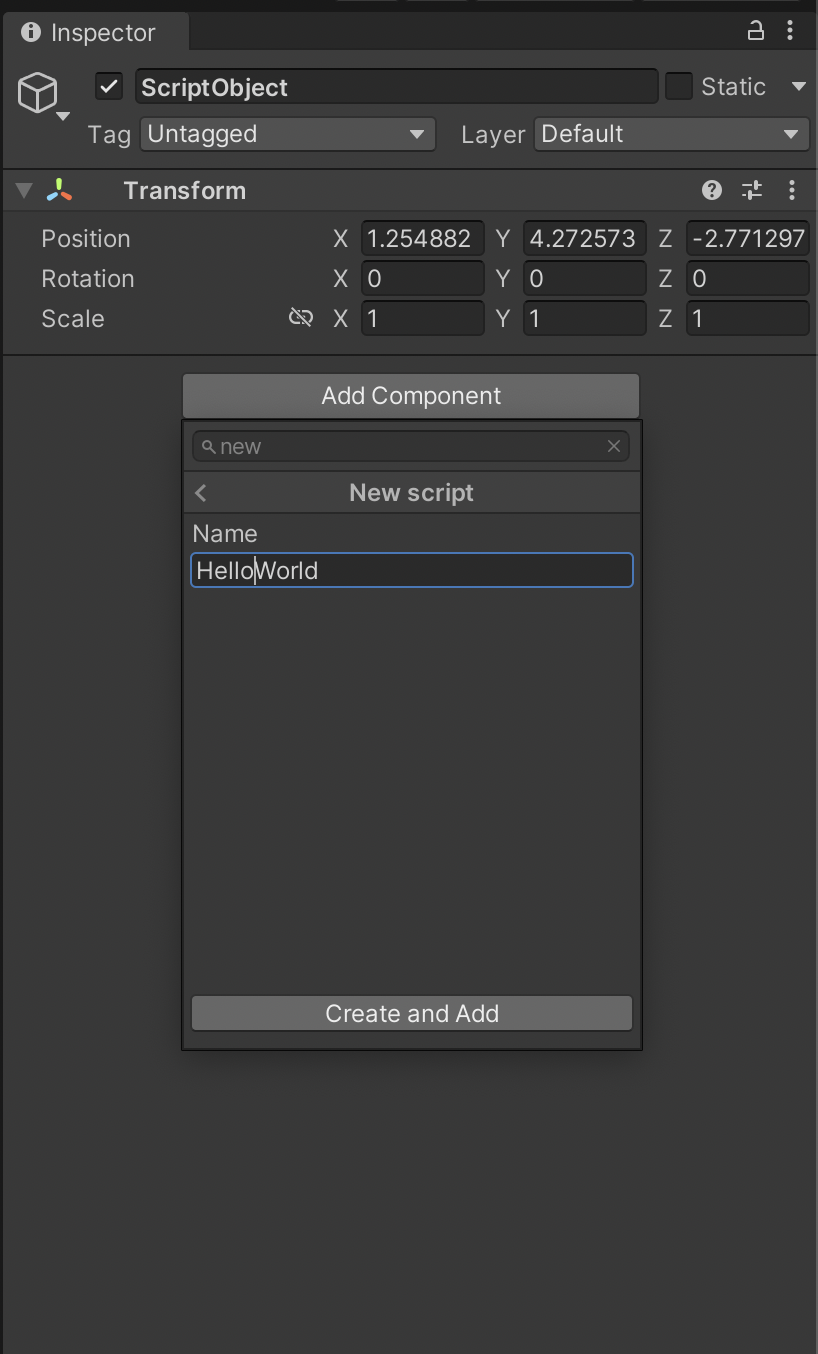 5. The typical first lesson in scripting in a new environment is the “Hello, World!” exercise, which is what we will do with this new script. Name the new script HelloWorld, and select the Create and Add button.