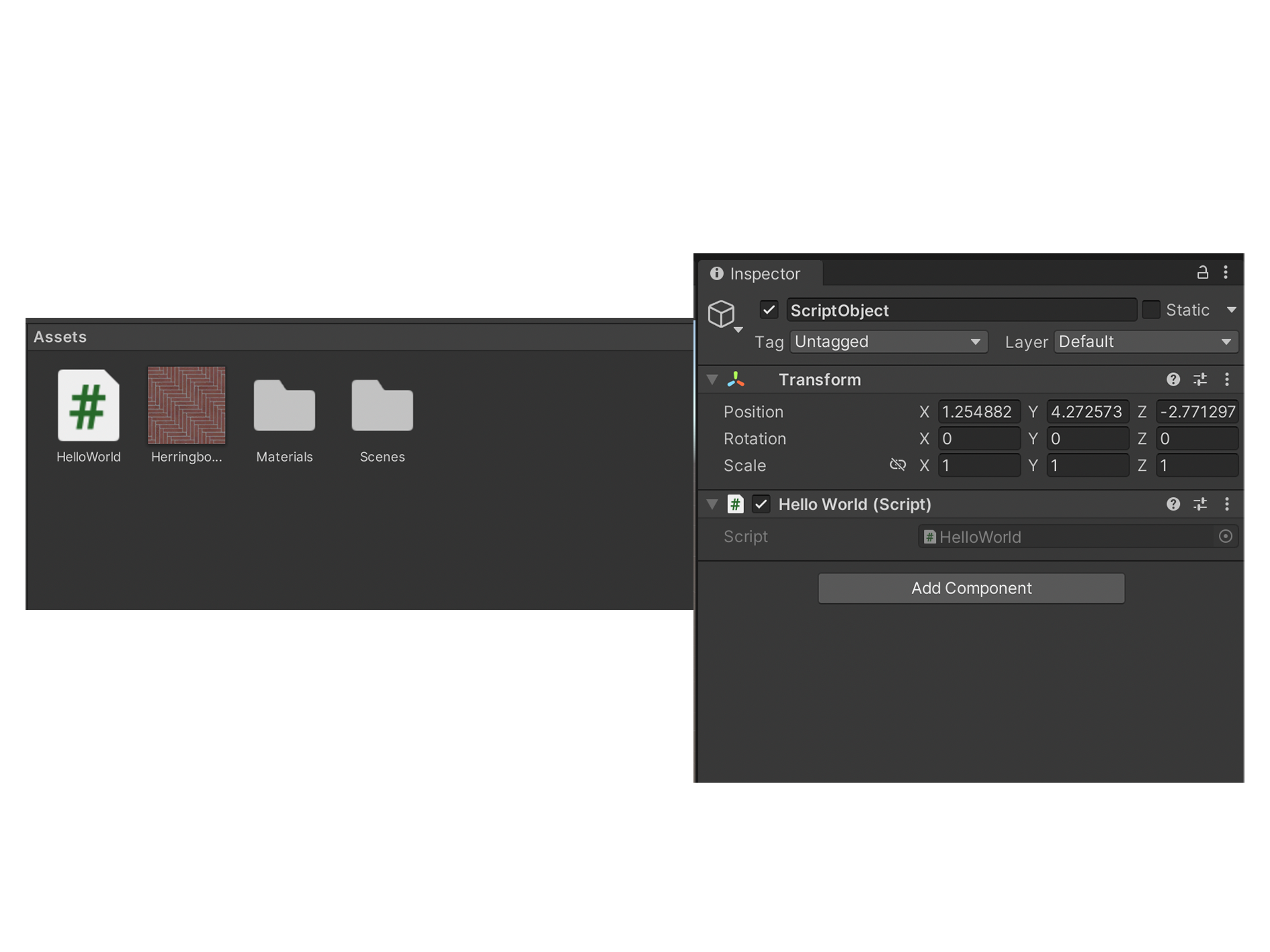 In this tutorial, you will create a simple “Hello World” component and add it to a GameObject. You will see how you can use scripts to manipulate what appears in the Inspector window for any GameObject. Along the way, you will learn about the tools and windows used for programming in Unity.