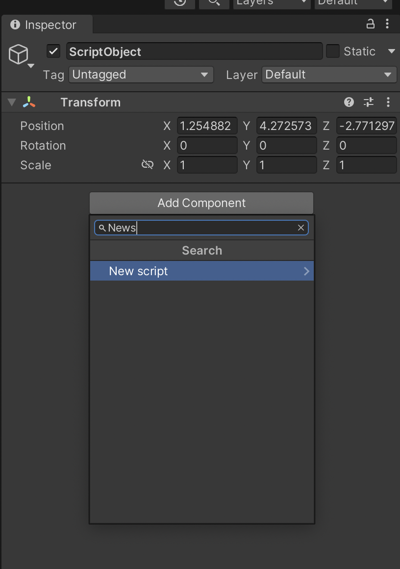 4. While your new GameObject is still selected, select Add Component in the Inspector window. Select the New Script option.