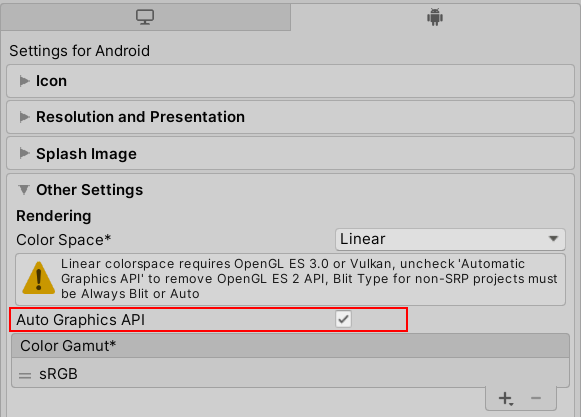 6. Select the Player section on the left of the dialog window, then select the Android tab. Select the grey arrow to expand the Other Settings foldout located towards the bottom of the list.