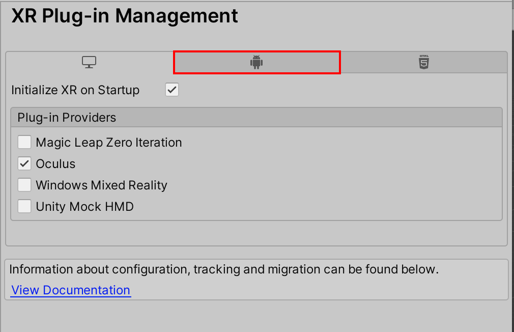 4. If you are using an Oculus Quest without Oculus Link, you’ll need to create Android builds to test your VR experience. If there is no Android tab available here, check that you have correctly set up the Android development environment.