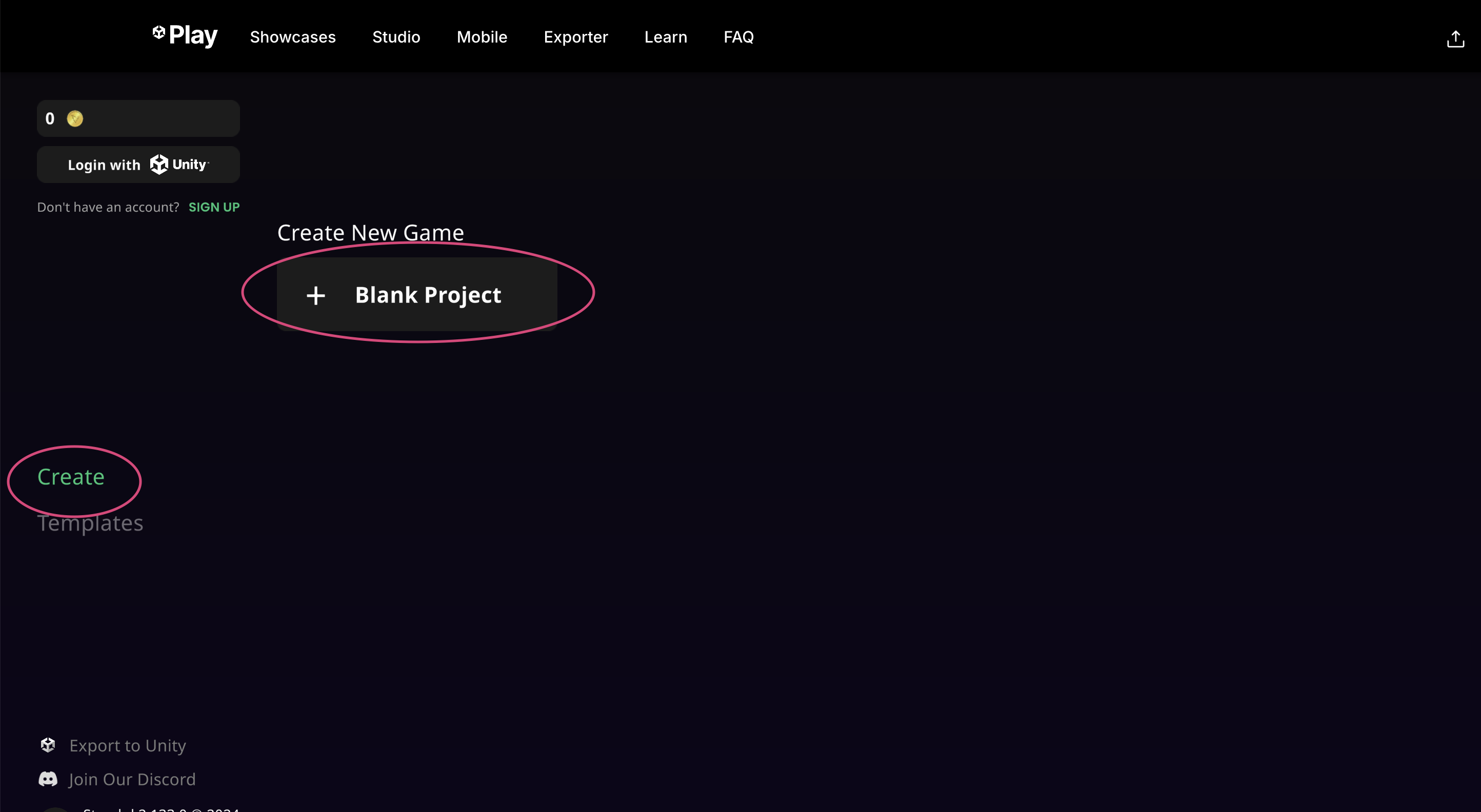 - Clicking the + Blank Project button in the "Create New Game" section of the Project page
