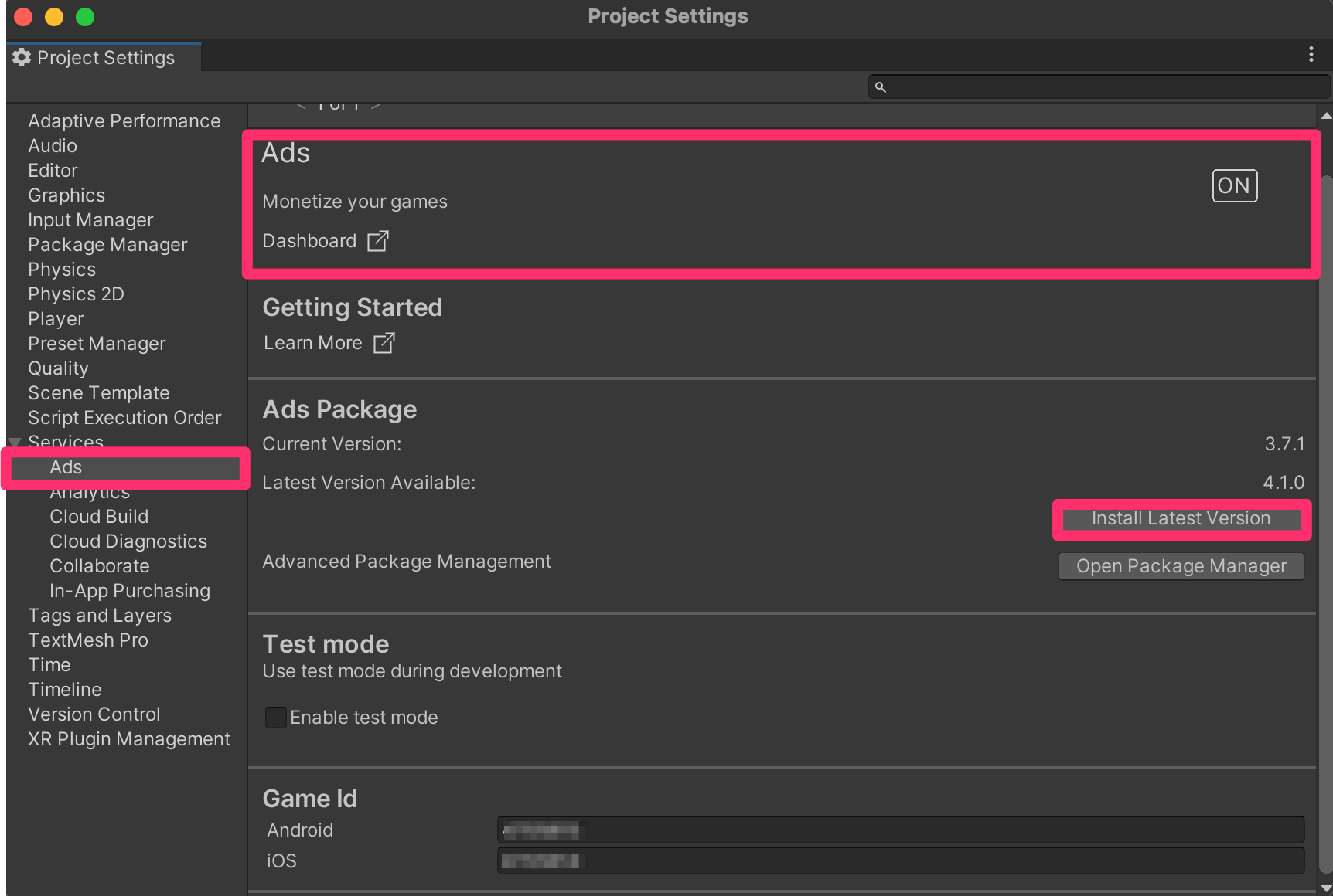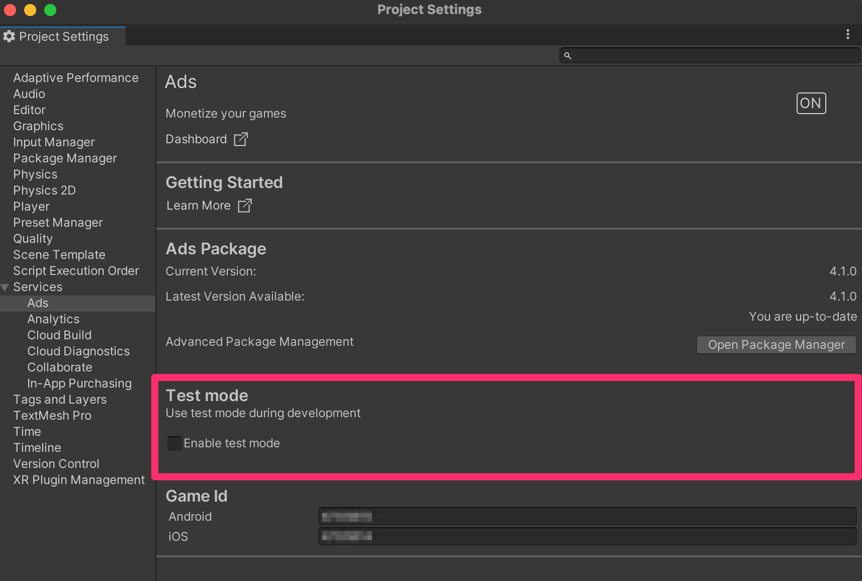 8. In the Project Settings window tab panel, select Ads and then enable Test Mode. If you don’t enable Test Mode and watch real ads on devices to test while developing, your account can be flagged for fraud.