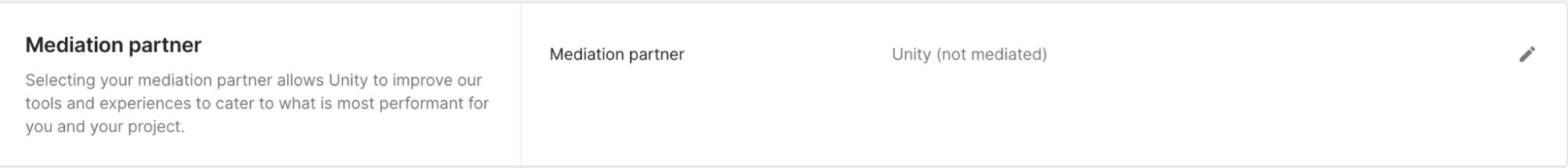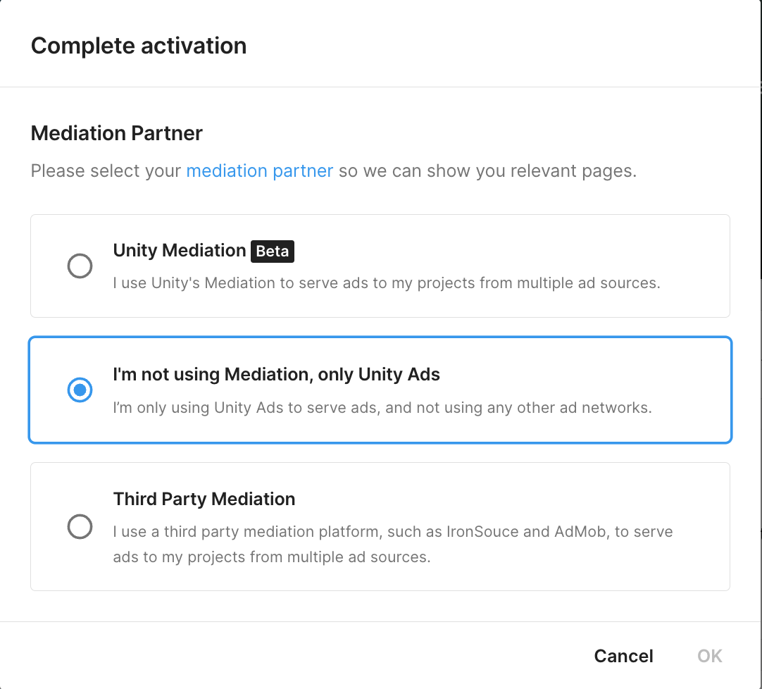 Note: If this dialog window is not displayed, it means you have already completed the Unity Ads activation. Go to Monetization > Project Overview > Settings > Mediation partner and check that the Mediation partner field states Unity (not mediated).