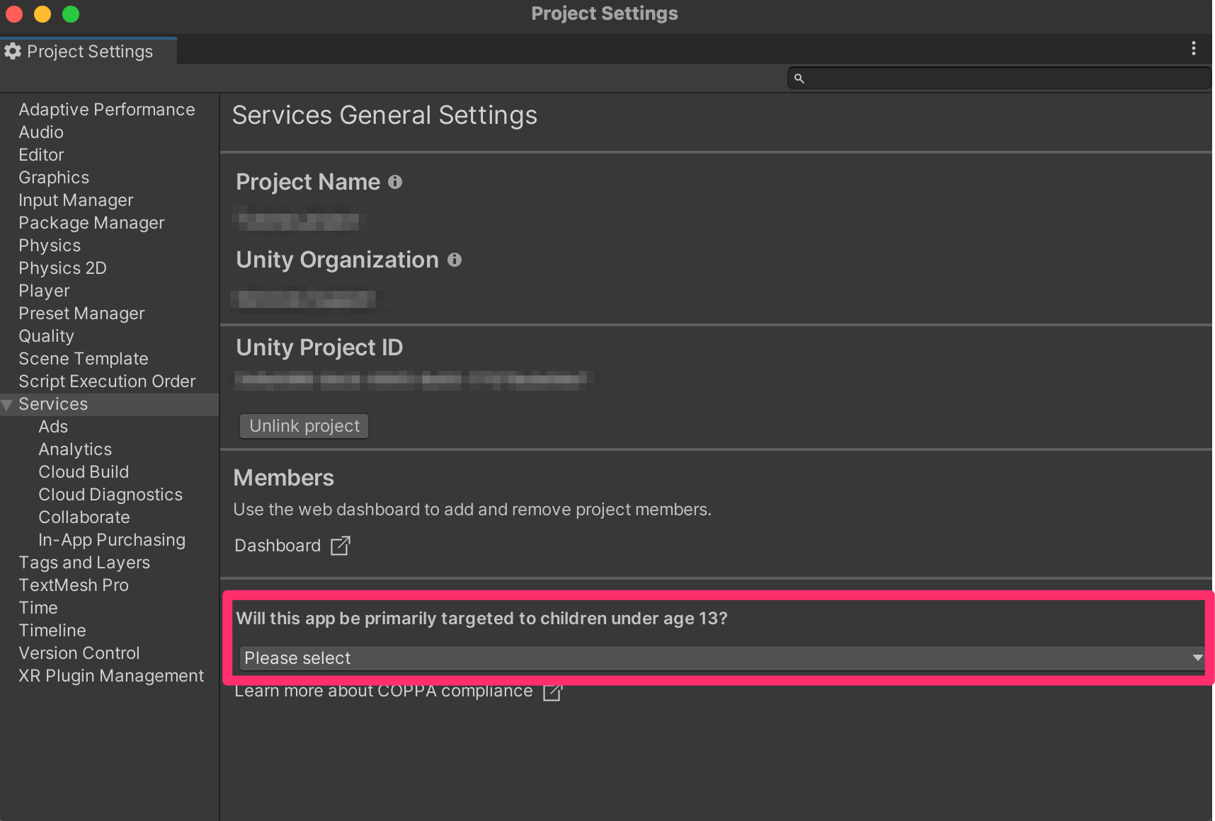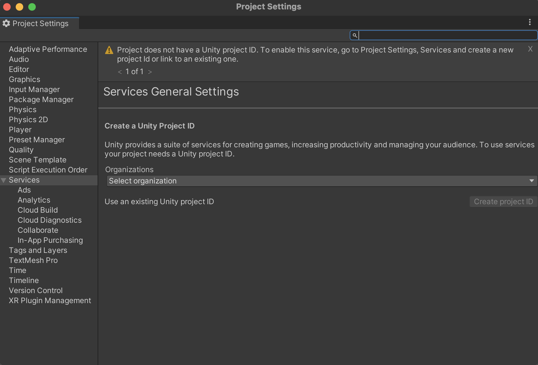 Before you can display ads in your Unity project, you need to enable Unity Services for it: