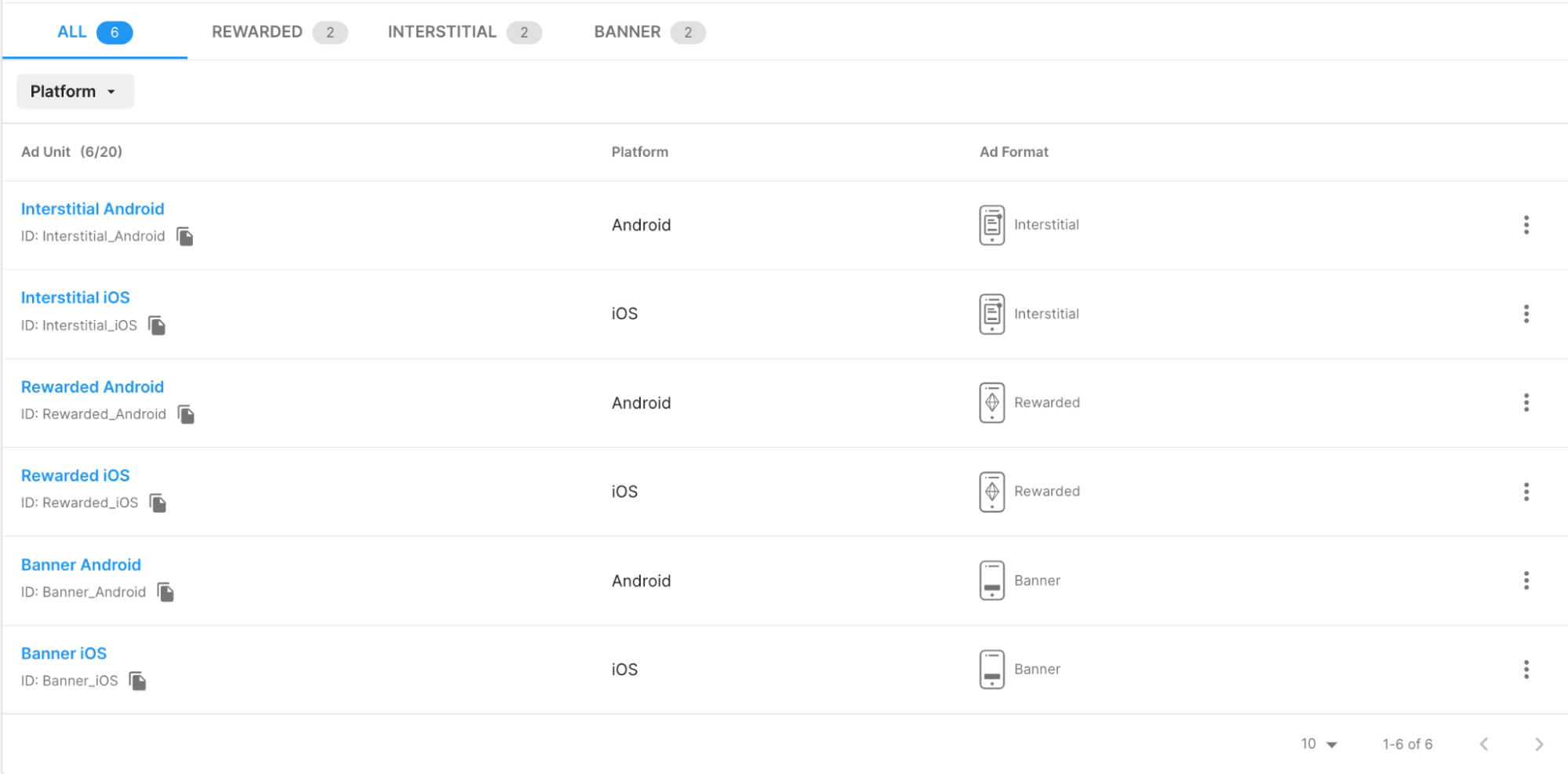 For example, you wouldn’t want players to have the ability to skip a lucrative rewarded video. All projects in the Dashboard begin with three Ad Units for each platform, for example Interstital_Android, Rewarded_Android, and Banner_Android for the Android platform.