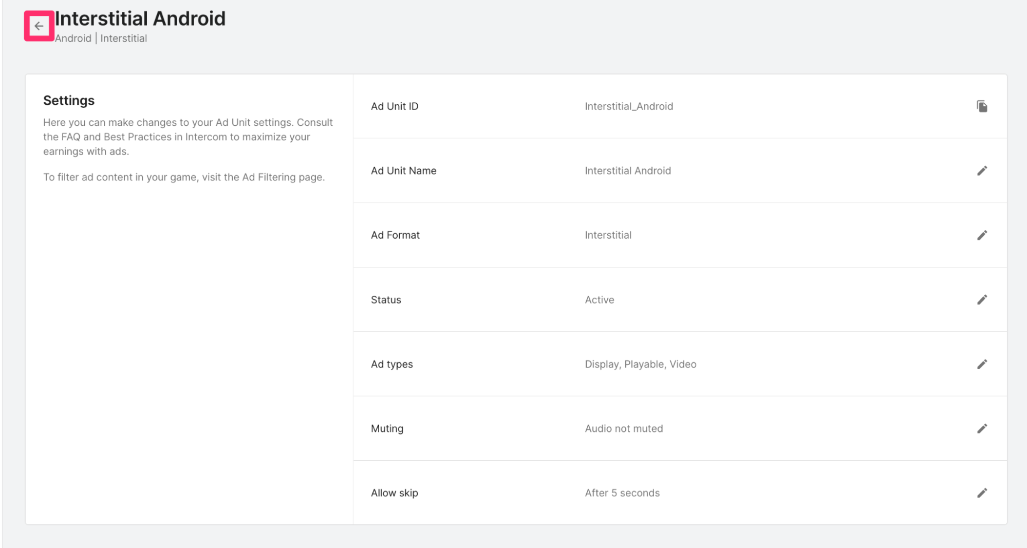 4. Select an Ad Unit ID to view its settings. Select the arrow to the left of the placement name to return to the placement list.