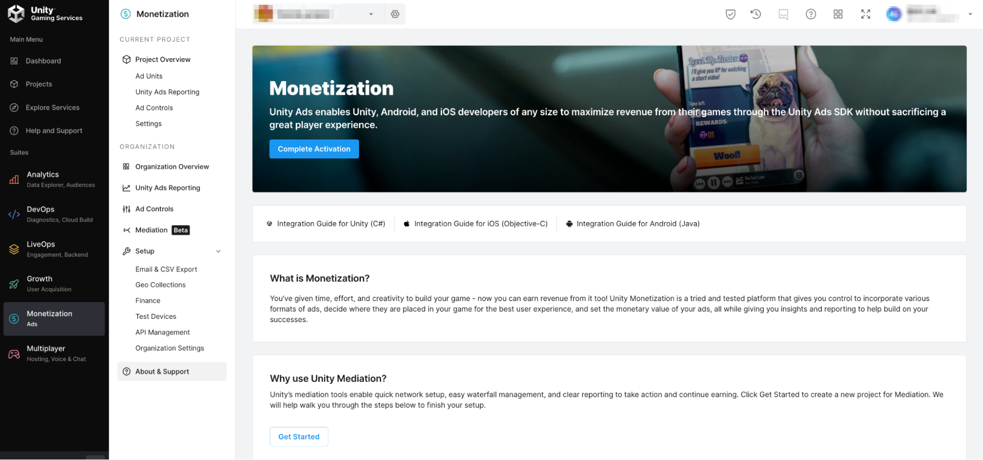 4. If you haven’t completed activating monetization for your Unity organization, select Complete Activation.