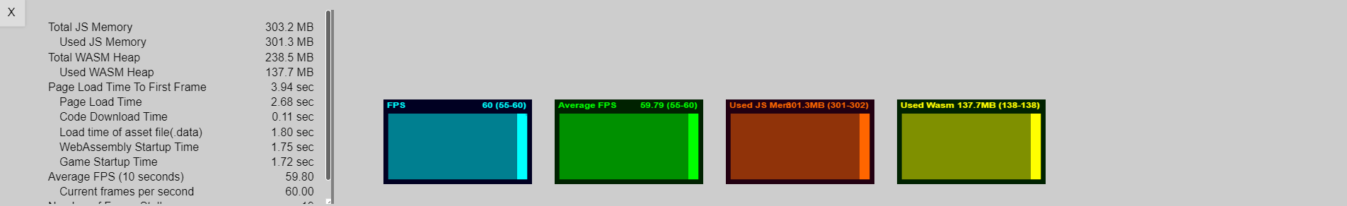 Here we can see some properties of the running game, including both the WASM memory heap size and the total JavaScript memory used (available in Chrome/Edge browsers only). The data also includes various time measurements for the page load time. Having these measurements directly overlaid on the game is convenient when testing with different devices.