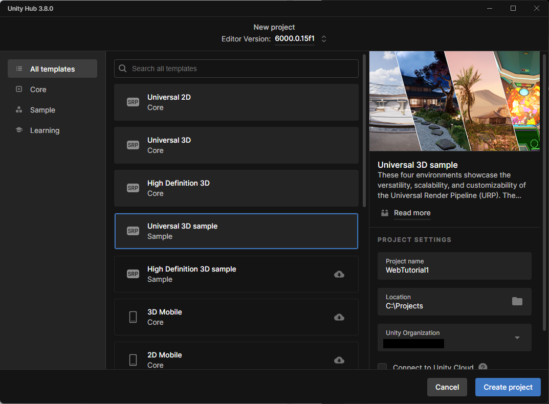 1. From the Unity Hub, select the New Project button, open the Editor Version dropdown and select the Unity 6 version you just downloaded, select the Universal 3D Sample template, and select the Create project button.