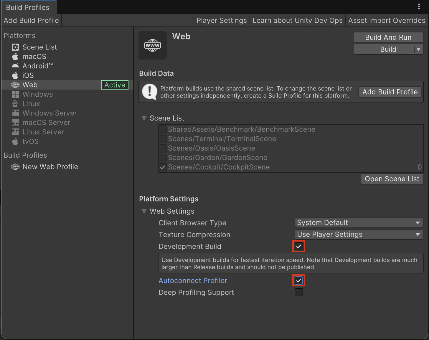 1. Open the Build Profiles window (File > Build Profiles) and enable Development Build and Autoconnect Profiler.
