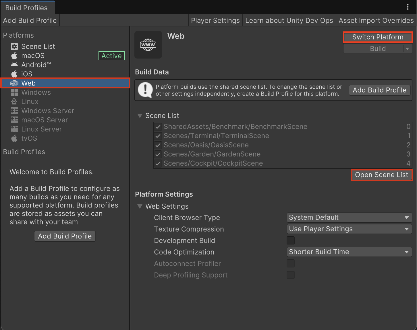 3. Once the build target has switched to Web, select the Open Scene List button in the right panel and disable all the scenes except for the CockpitScene.